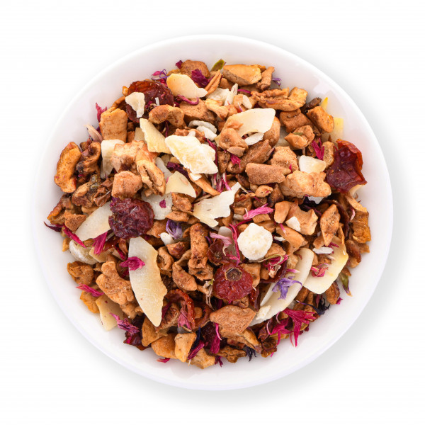 Apfelstücke (geröstet), Kokoschips geröstet, Hagebuttenschalen, Ananasstücke, natürliches Aroma, Kokosraspeln, Kornblumenblüten