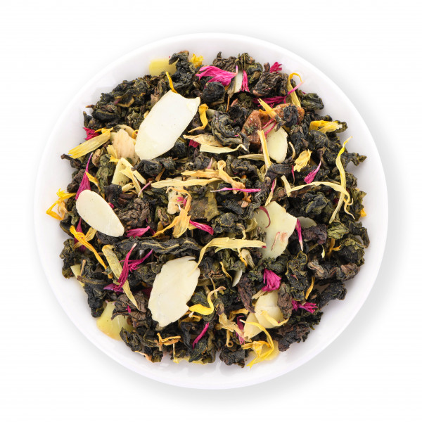 Grüner Tee, Oolong Tee, Birnenstücke, natürliche Aromen, Mandelstücke, Ringelblumenblüten, Kornblumenblüten