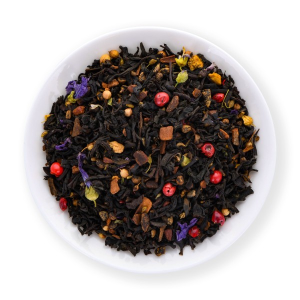 Schwarzer Tee, Zimt, Kardamom, Ingwer, Koriander, Nelken, rosa Pfefferkörner, Anissamen, natürliches Aroma, Malvenblüten