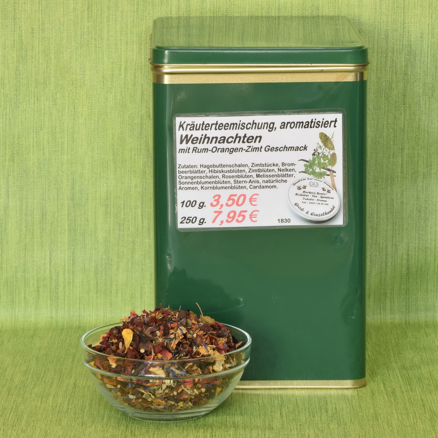 Hagebuttenschalen, Zimtstücke, Brombeerblätter, Hibiskusblüten, Zimtblüten, Nelken, Orangenschalen, Rosenblüten, Melissenblätter, Sonnenblumenblüten, Stern-Anis, natürliche Aromen, Kornblimenblüten, Cardamon.